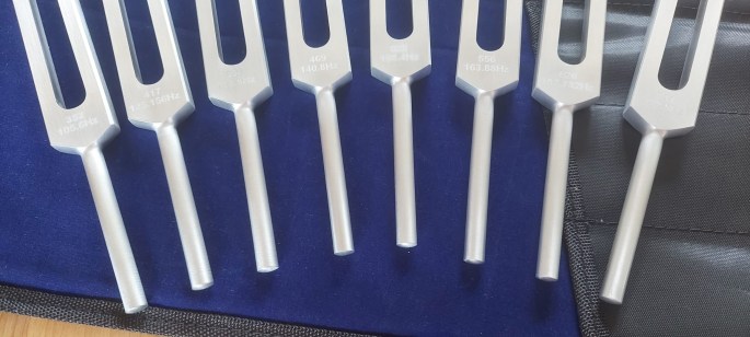 - Strike one of more tuning-forkson a soft object such as your knee, or the edge of your chair. (If it “rattles” you struck it too hard)